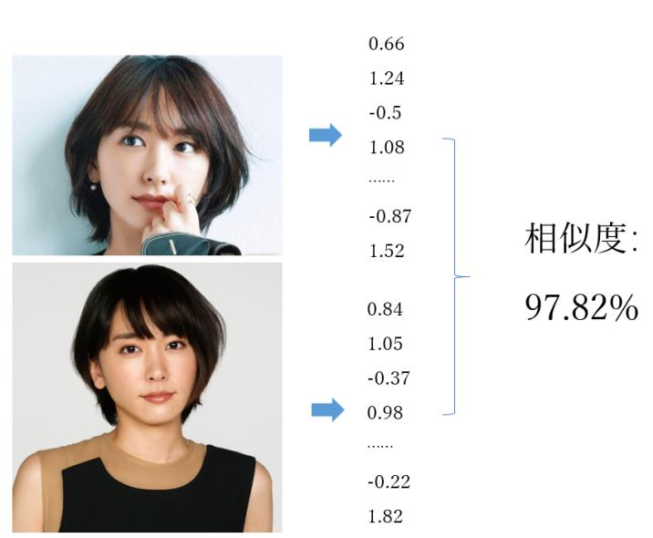 这里我们需要了解一下“相似度”的概念。前面提取出来的人脸特征数值串可以用来表征人脸特征,输入两组不同人脸图片的特征值,通过某些规则定义的算法公式可以得到两个特征之间的相似度。